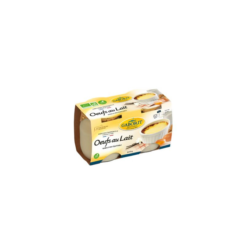 Les oeufs au lait ont une texture fondante et une douceur unique au palais ! C'est une recette traditionnelle de la famille Gaborit : du lait entier de Jersiaise, des oeufs frais, un peu de sucre roux non raffiné équitable et un soupçon de vanille bio et équitable de Madagascar. Avis aux amateurs de tendresse pour le palais, on devine d'abord le lait de Jersiaise et sa saveur florale caractéristique, puis vient le goût des oeufs, dans un bel équilibre.