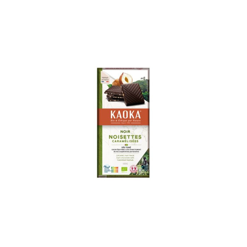 pâte de cacao Sao Tomé*(1) 47,3%, sucre de canne blond*(1) 27,5%, ECLATS DE NOISETTES caramélisées* 12,0%, (ECLATS DE NOISETTES*(1) 8,4%, sucre de canne blond* ), beurre de cacao*(1) 10,1%, BEURRE concentré (LAIT)* 3,1%, - * ingrédient agricole issu de l'agriculture biologique - (1)ingrédient issu du commerce équitable - contrôlé selon le référentiel FFL