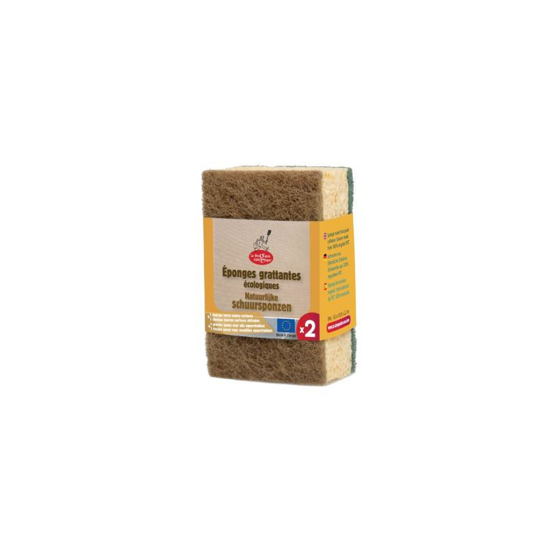 Une éponge avec abrasif vert multi-usages, pour bien récurer et nettoyer. Une éponge avec abrasif marron pour ne pas rayer les surfaces délicates. La cellulose de l'éponge est compostable et l'abrasif n'est pas valorisable.