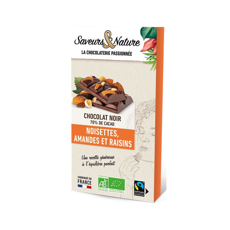 Tablette de chocolat noir 70% de cacao minimum incrustée d'Amandes, de Noisettes et de Raisins.