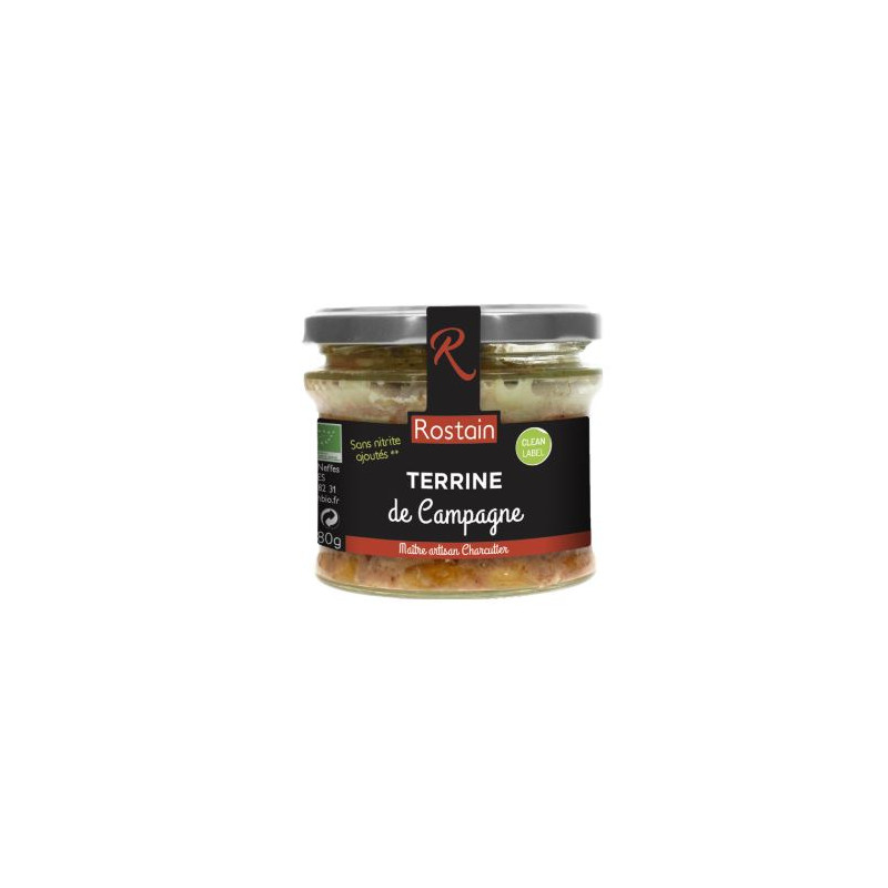 *Viande et foie de porc (71% origine France), *gras de porc (12% origine France), *couenne de porc (origine France), *fécule de pomme de terre, *oeuf, *échalote, sel de mer, *ail, *poivre noir, *muscade. *Ingrédient issu de l'agriculture biologique.
