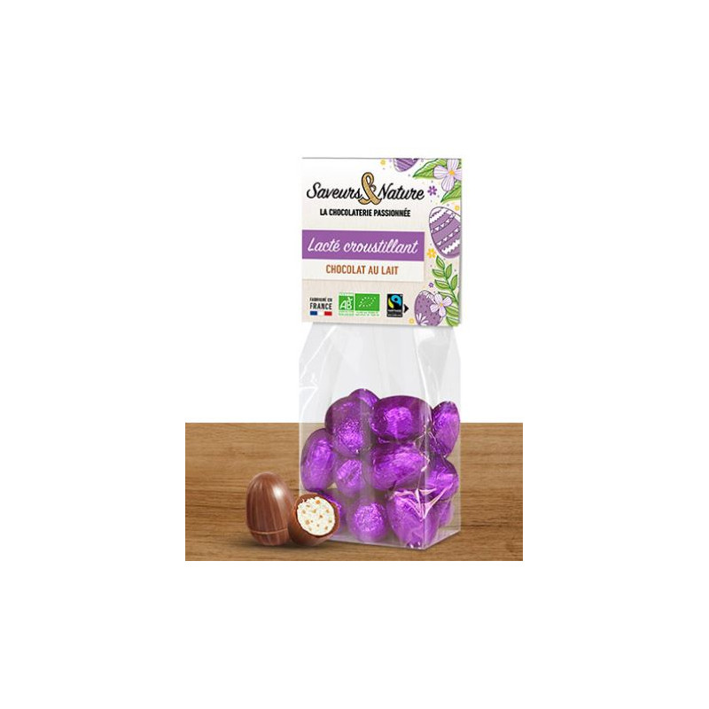 Ingrédients : chocolat au LAIT* (sucre de canne*, beurre de cacao*, poudre de LAIT entier*, pâte de cacao*), chocolat blanc* : 23% (sucre de canne*, beurre de cacao*, poudre de LAIT entier*, poudre de vanille*), poudre de LAIT écrémé* : 9%, BEURRE concentré*, éclats de NOISETTES* : 1%, sucre de canne*, extrait de vanille*. Peut contenir des traces de gluten, d’œuf, d’arachides, d’autres fruits à coque et de sésame.*Ingrédients issus de l’agriculture biologique.