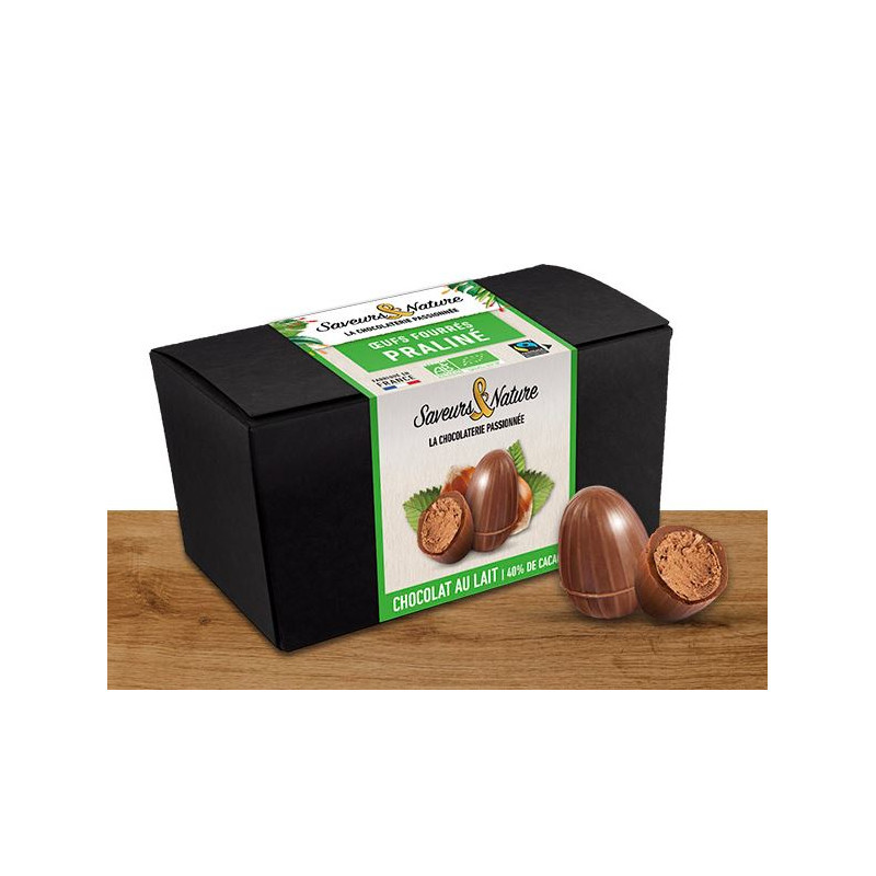 Ingrédients : chocolat au LAIT* (sucre de canne*, beurre de cacao*, poudre de LAIT entier*, pâte de cacao*), praliné NOISETTE* : 33% (NOISETTES* : 16.5%, sucre de canne*), chocolat noir* (pâte de cacao*, beurre de cacao*, sucre de canne*). Peut contenir des traces de gluten, d’œuf, d’arachides, d’autres fruits à coque et de sésame.*Ingrédients issus de l’agriculture biologique.