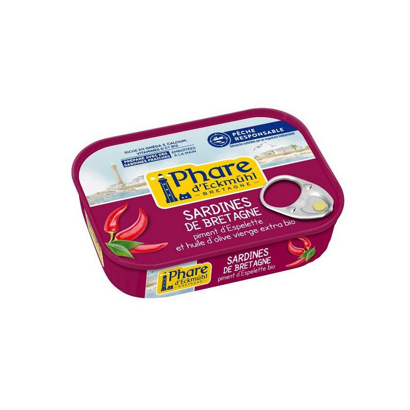 Préparées avec une délicieuse sauce au piment d'Espelette BIO, ces sardines sont issues d'une pêche responsable côtière en Atlantique Nord-Est. Préparées à la main à Douarnenez en Bretagne, elles sont riches en oméga 3.