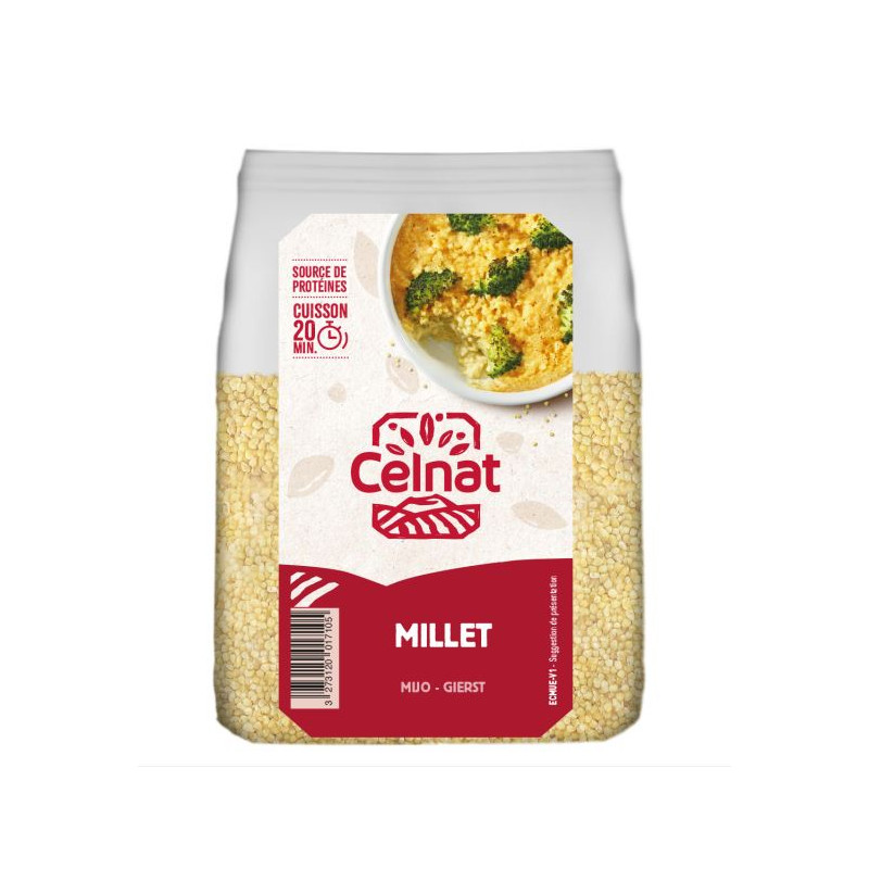 Le millet sera délicieux accompagné de légumes et d'une purée de légumineuses en grains ou en flocons (lentilles corail, pois cassés, pois chiches, azukis). Le mil et le millet, deux plantes très voisines, sont cultivées en Afrique et en Asie depuis plusieurs millénaires (environ 5000 ans avant J.-C.). Devenue la céréale de base des Gaulois, le millet avait totalement disparu de nos tables. Aujourd'hui, cette céréale très intéressante est appréciée pour son agréable saveur. Ses proches cousins, le mil et le sorgho, ont joué et jouent un rôle essentiel dans l'alimentation des populations africaines et asiatiques.