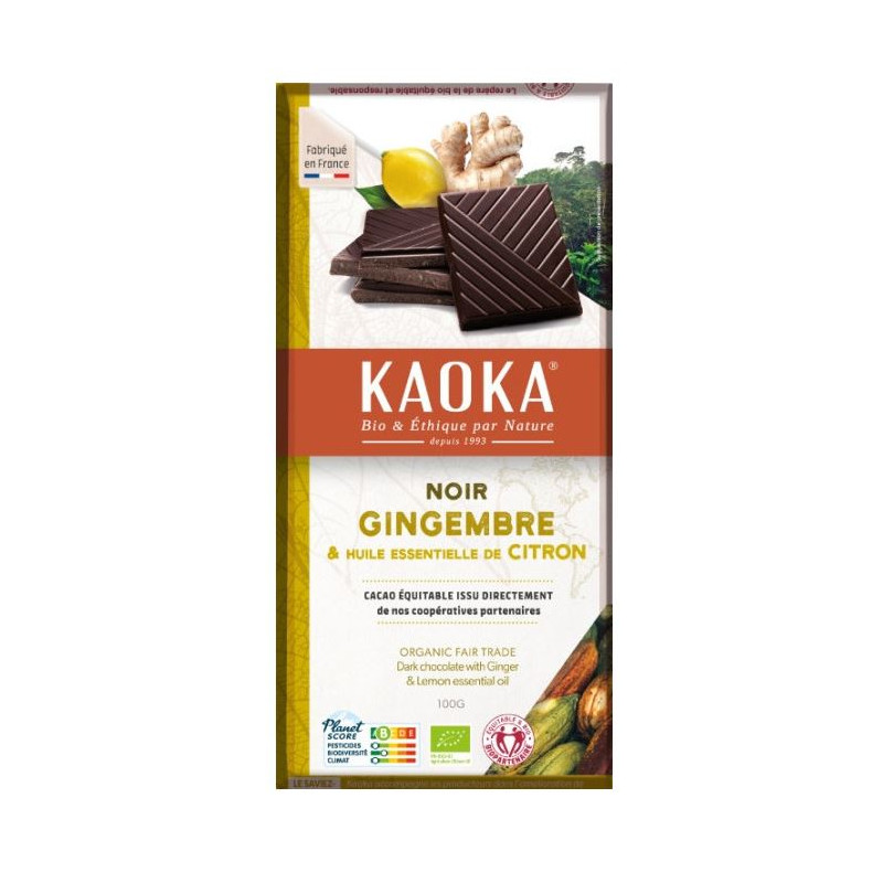 Pâte de cacao Pérou*(1) 41,6%, sucre de canne blond*(1) 36,6%, beurre de cacao*(1) 12,2%, pépites de gingembre confit* 8,0% (gingembre* 4,4%, sucre* ) , poudre de gingembre* 1,5%, huile essentielle de citron* 0,1%, - * ingrédient agricole issu de l'agriculture biologique - (1)ingrédient issu du commerce équitable - contrôlé selon le référentiel FFL