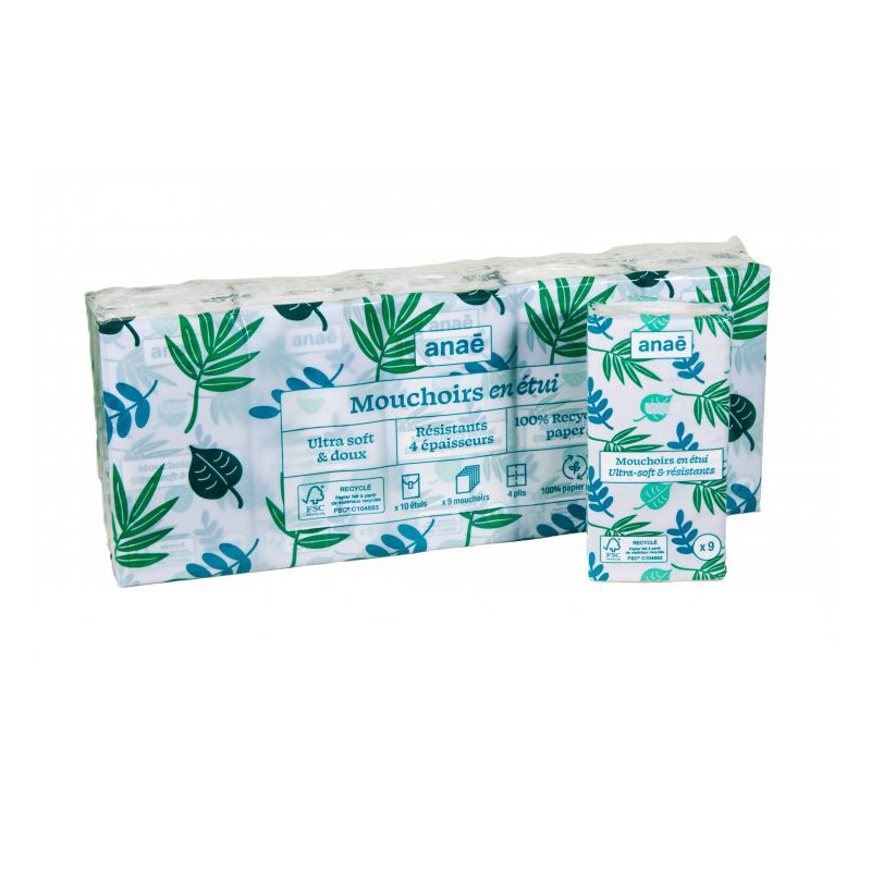 Extra-doux et très résistants, nos mouchoirs en étui sont réalisés en papier 100 % recyclé, certifié FSC© ! Fabriqués en Europe de l'Ouest et conçus en ouate de cellulose de quatre épaisseurs, ils n'irritent pas le nez ni les muqueuses. Caractéristiques : Pack de 10 étuis de 9 mouchoirs. Le film plastique des étuis comporte un minimum de 50 % de matière recyclée. étui : 11 x 5 x 2 cm pack : 27,5 x 11 x 4,5 cm 0,257 Kg